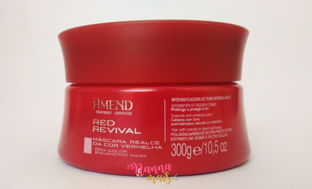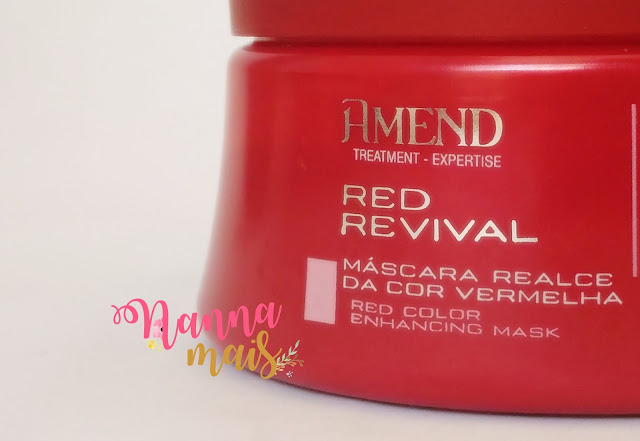 A Máscara Realce da Cor Vermelha Red Revival AMEND promete e cumpre. Antes de fazer o seu uso, meu cabelo estava bem desbotado, levemente rosa e as pontas alaranjadas. Ao finalizar o meu cabelo estava Vermelho Rihanna novamente, hidratado e com brilho.
