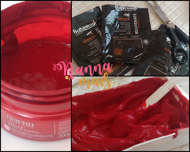 Depois de feita a misturinha, deixamos agir por 15 minutos (tempo máximo da máscara branca, o tempo máximo da Máscara Realce da Cor Vermelha Red Revival AMEND é 20 minutos) e depois enxaguamos bem.